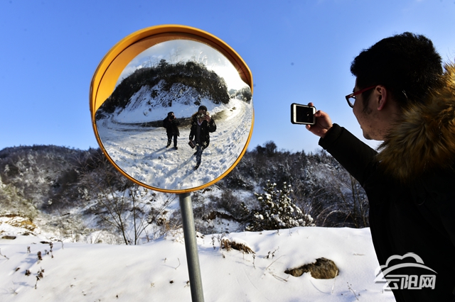 云陽縣農(nóng)壩鎮(zhèn)云峰村盤山公路反光鏡里的雪景。賞雪鄉(xiāng)原景、悅振興愿景,這里的日出日落萬道霞光醉游人。