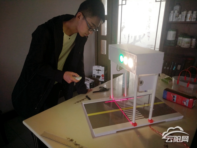 近日,記者來(lái)到云陽(yáng)中學(xué)高三4班見(jiàn)到了胡鴻豪,這個(gè)理科班的大男孩看起來(lái)靦腆又害羞,但說(shuō)起他設(shè)計(jì)的交通信號(hào)安全警示線便開(kāi)始滔滔不絕了。