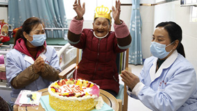 看著熱騰騰的長壽面和漂亮的蛋糕,在沒有家人陪伴的病房中,有一群跟家人一樣親的護理員陪伴著自己,保護著自己,此情此景讓韓婆婆留下了感激的淚水。