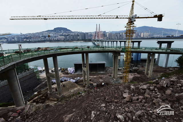 云陽縣長江大橋南橋頭互通提速擴建工程,一名工人師傅在現(xiàn)場指揮鋼材吊裝,為加快進度做準備。