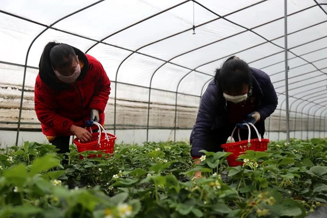 近日,小編在鳳鳴鎮(zhèn)陽(yáng)之鳳生態(tài)采摘園看到,一顆顆鮮紅的草莓點(diǎn)綴在綠葉間,兩名工人戴著口罩、提著籃子正在大棚內(nèi)采摘草莓。