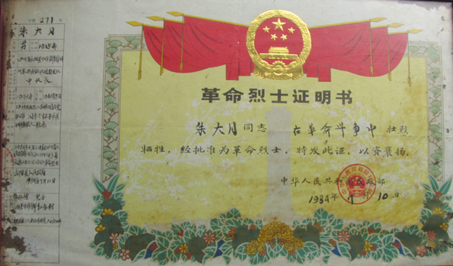 朱大月革命烈士證明書