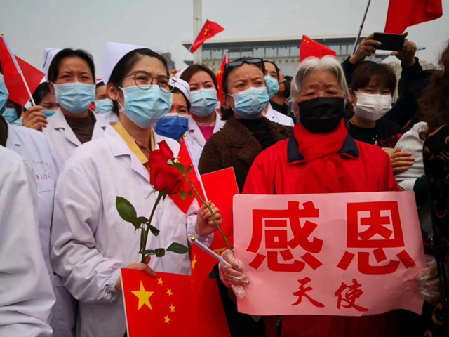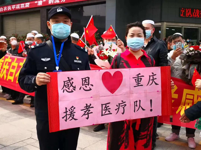 在歡送現場,志愿者們為醫療隊員搬運行李,市民們高舉著“告別重慶白衣天使們,謝謝你們!孝感的青海拉面永遠為你免費”等橫幅,在場的各界群眾一直高喊著“辛苦了!感謝你們,白衣天使”。