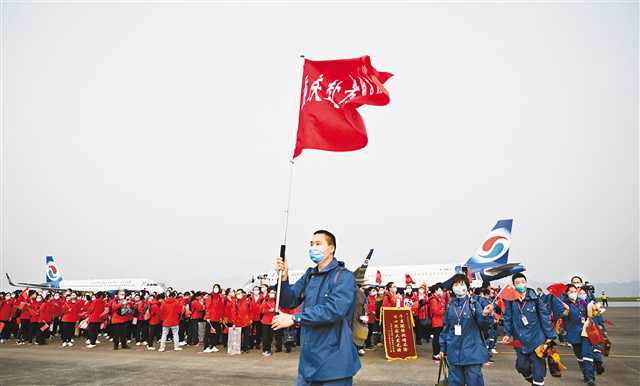 重慶日報訊 (記者 楊帆 張珺)新冠肺炎疫情發生以來,按照國家統一部署,我市陸續派出7批次812名隊員對口支援湖北孝感。3月23日下午,赴湖北孝感市新冠肺炎防治工作對口支援隊首批669名隊員圓滿完成任務,乘飛機凱旋歸來。市委書記陳敏爾,市人大常委會主任張軒,市政協主席王炯,到江北國際機場迎接,代表市委、市人大常委會、市政府、市政協和3000多萬全市人民向隊員們致以崇高敬意,對大家平安凱旋表示熱烈歡迎,向他們及他們的家人表示親切慰問和衷心感謝。
