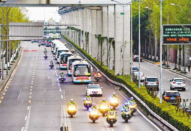 盛情相迎 3月23日下午,渝北區機場路,在迎賓騎警的引領下,載著醫療隊員的大巴行駛在路上。記者 龍帆 攝