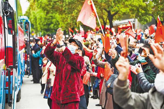 “傾城”相送 3月23日,重慶醫療隊員乘車離開孝感,自發前來的孝感市民站滿道路兩側為隊員送行。新華社記者 胡虎虎 攝