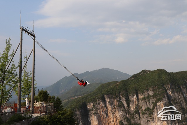 欣賞風景之余,記者被山谷傳來的尖叫聲吸引,原來是游客在體驗“懸崖秋千”,顧名思義,“懸崖秋千”安裝在距離石筍河上方600米。按奈不住內心的小激動,記者親測,坐上了“懸崖秋千”,瞬間向懸崖外蕩去,失重狀態下帶給人以驚險刺激的感受,全程10分鐘坐下來已經“腿軟”了,記者打聽到,“懸崖秋千”目前優惠票價為50元/人。