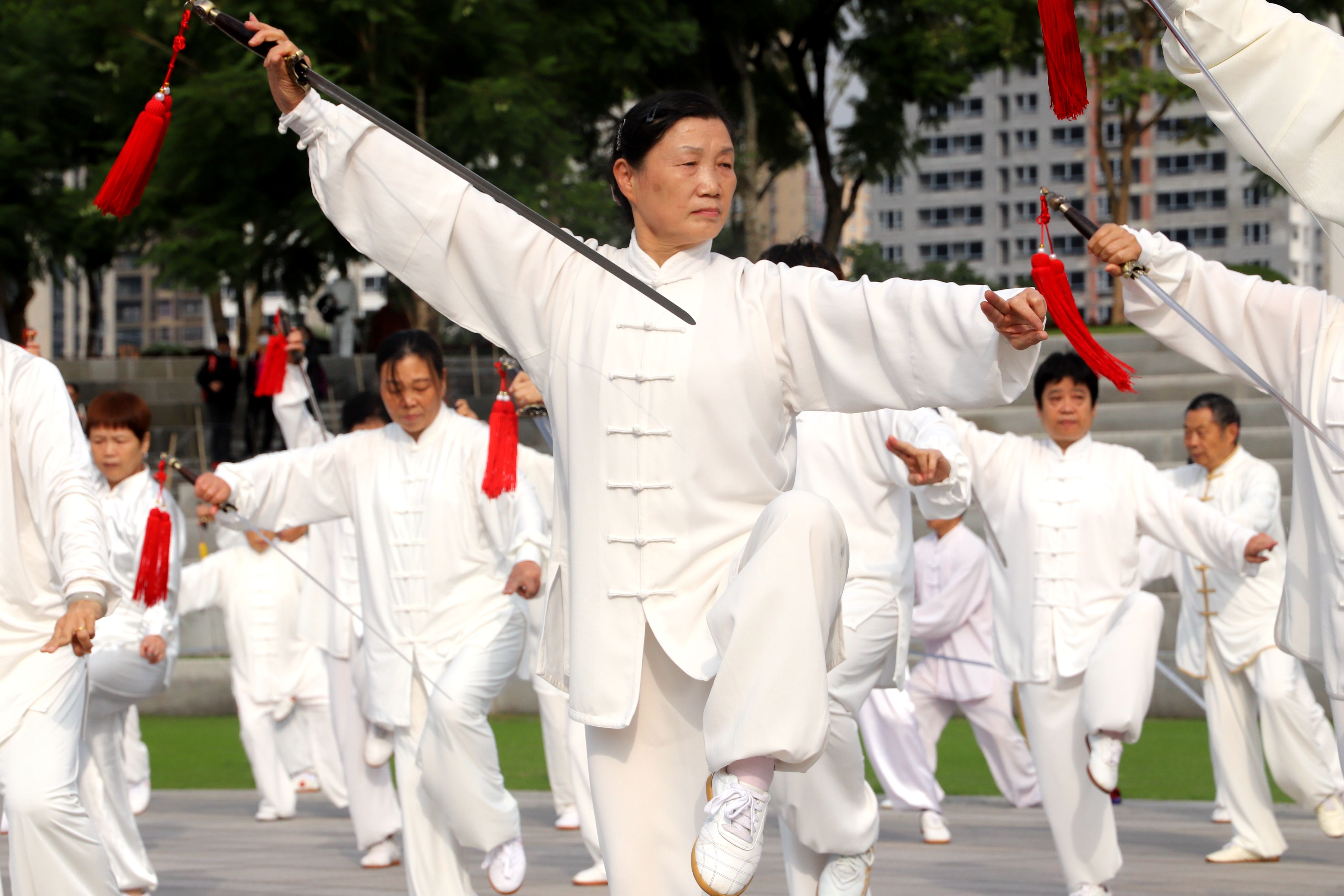 開步起勢、白鶴亮翅、左右攬雀尾......活動從太極拳愛好者表演的24式簡化太極拳開始。蓮花扇、功夫扇表演將武舞融合,扇面時開時合,剛?cè)岵?jì);太極拂塵、楊氏太極刀、太極雙環(huán)、太極劍等表演將傳統(tǒng)太極拳與器械相結(jié)合,舒展大氣,瀟灑飄逸;雙人柔力球、集體柔力球表演以迎、納、引、拋為動作要領(lǐng),整個運(yùn)動過程隊列整齊,動作協(xié)調(diào)流暢,如行云流水。