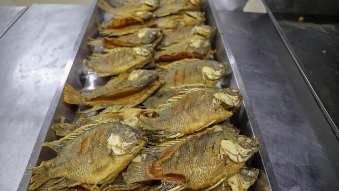 日前,在宏霖食品有限公司網貨加工區,自熱系列烤魚生產線上,工人們有條不紊地忙碌著。他們將羅非魚灌料腌制,抺上淀粉后放進油鍋里炸至兩面金黃,再進行裝袋。這是公司電商平臺急需發貨的一批訂單,工人們正在加班加點地生產。