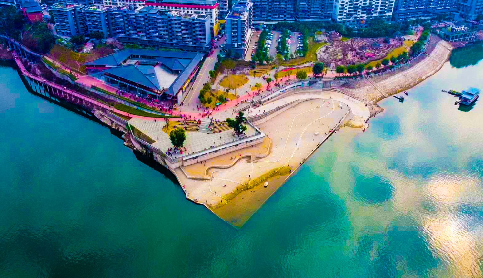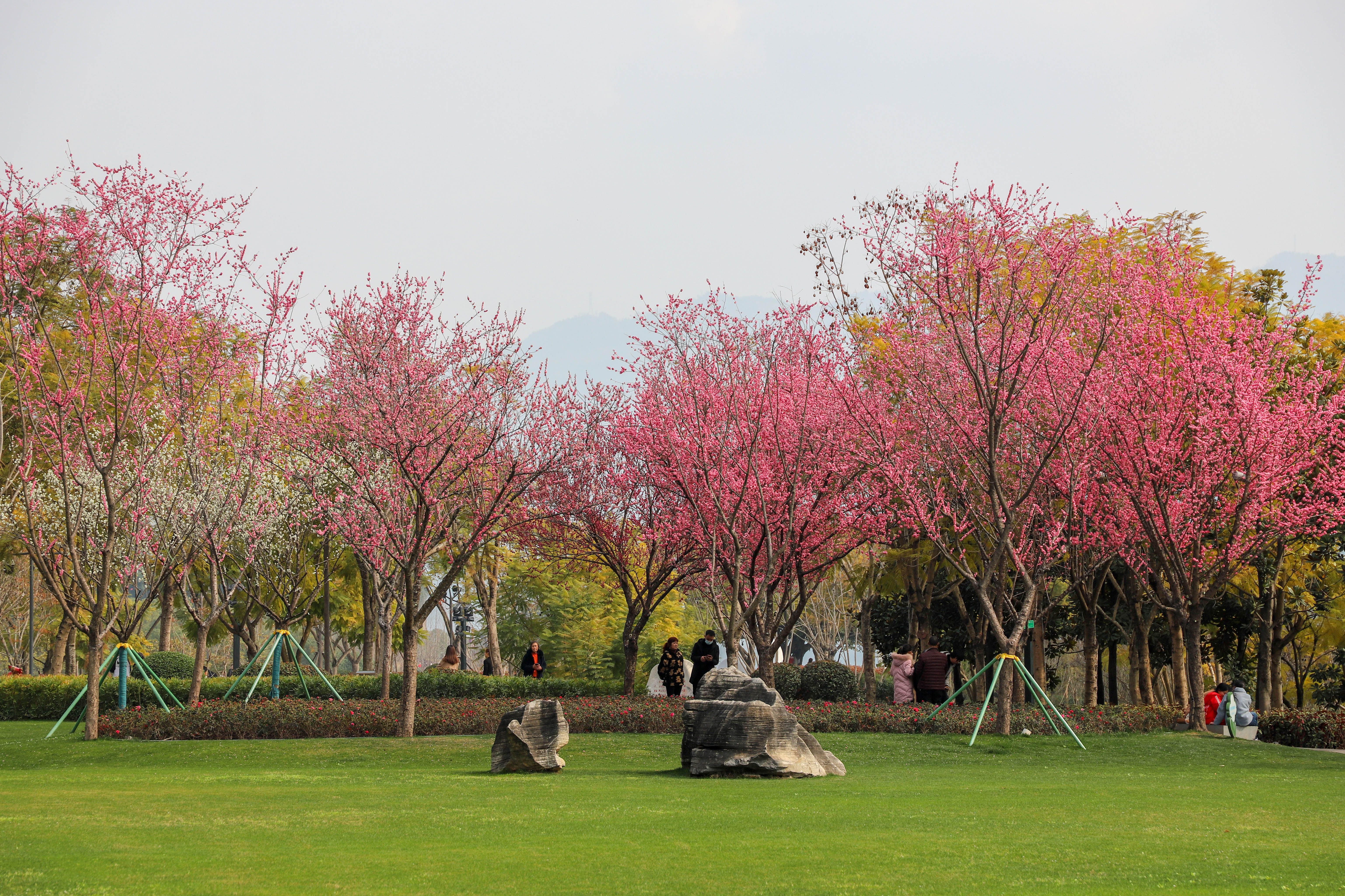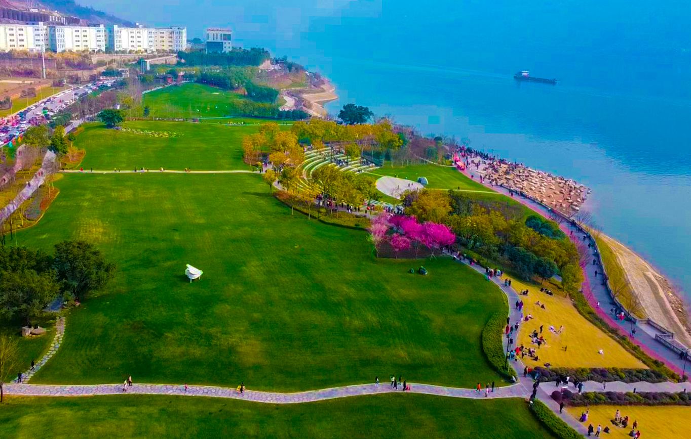 在月光草坪,紅梅那一抹紅暈點亮了公園的初春,空中俯瞰,綻放的梅樹組成“心”形花海景觀,鑲嵌在茵茵芳草間,演繹著春日浪漫。“云陽這些公園非常漂亮,現(xiàn)在這些花開了。春暖花開,像一幅美麗的畫卷,這邊來耍一下非常開心非常好耍。”市民譚女士說。