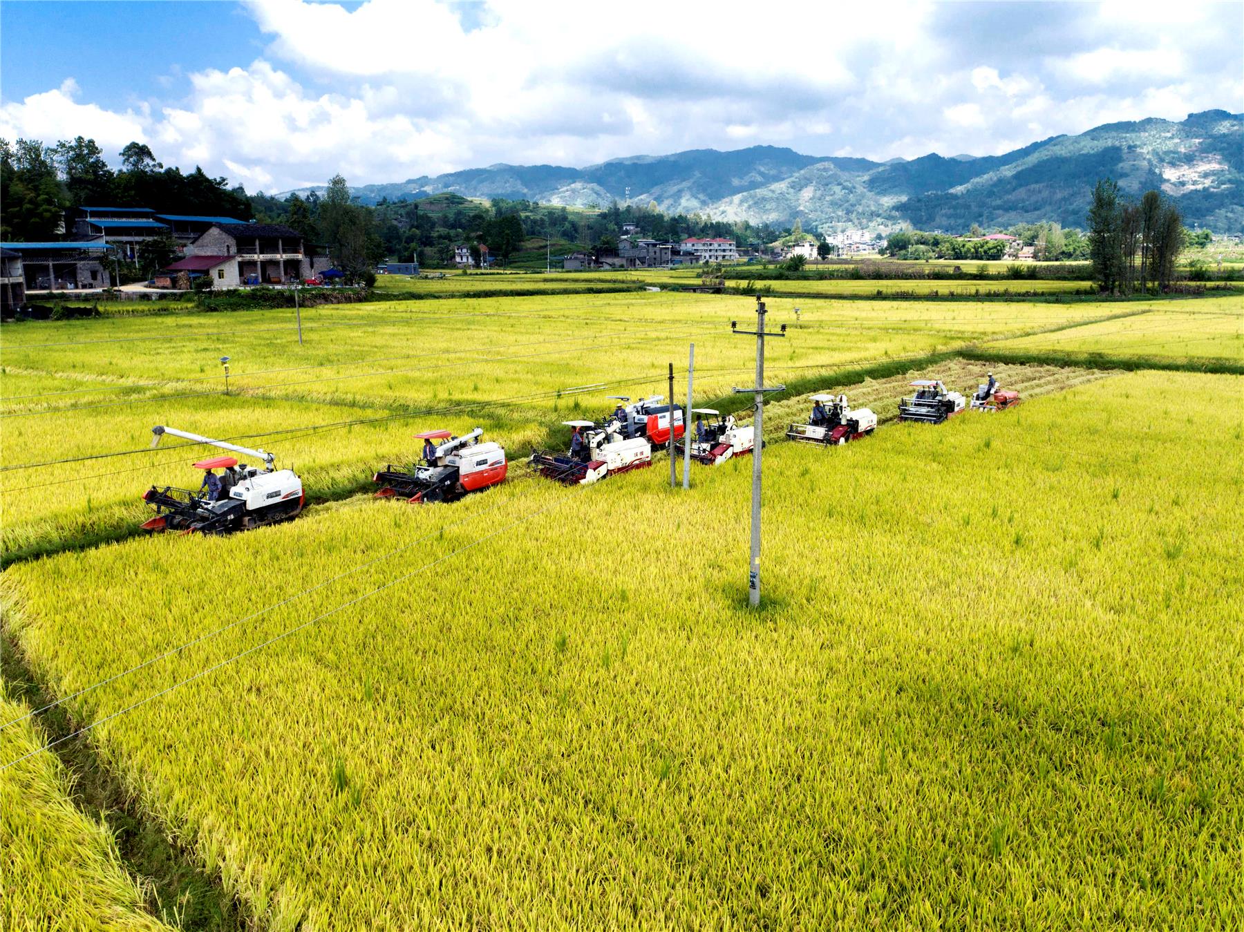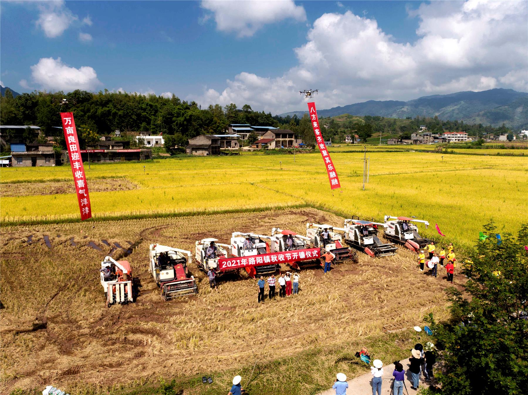 伴著喜氣洋洋的鑼鼓聲和高高飛揚(yáng)的空飄,路陽鎮(zhèn)水稻開鐮儀式舉行。在人們期盼的目光中,一字排開的8臺(tái)大型收割機(jī)正駛向稻田。藍(lán)天白云下,金燦燦的稻田美如畫卷。伴隨著機(jī)器轟鳴聲,機(jī)手們駕駛著收割機(jī)開足馬力穿梭在金色的田野中,沉甸甸的稻穗兒被收入袋中。
