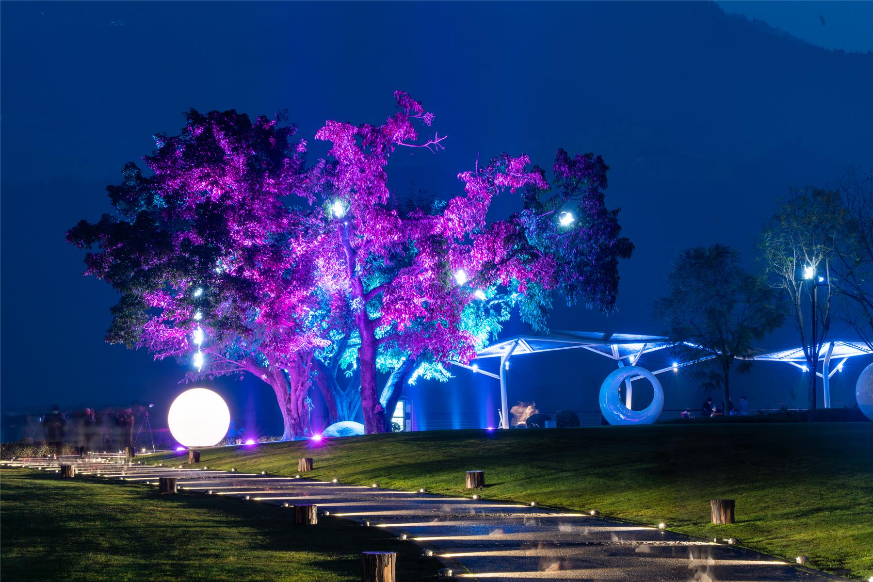夜幕降臨,月光草坪于光影描摹中完成華麗的變妝,霎時波光瀲滟、繁星璀璨,行走其間猶如邂逅一幕幕夢幻的“星月童話”。在“花好月圓夜”主題燈飾的裝扮下,公園盡顯風(fēng)情萬種。11處智能化節(jié)點燈飾,塑造可行、可聽、可觀、可賞的自然休閑體驗空間。