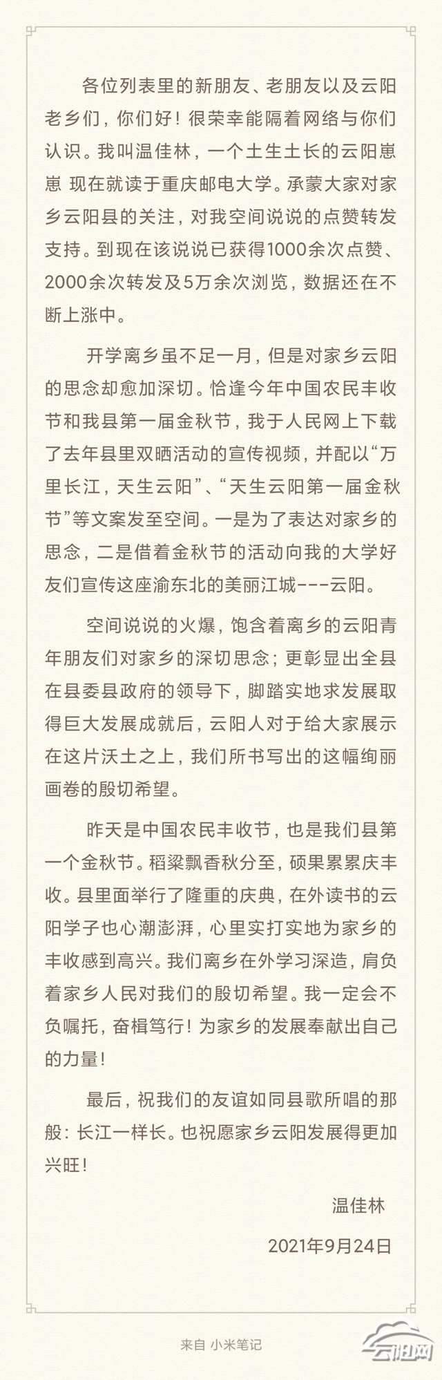 “縣里面舉行了隆重的慶典,在外讀書的云陽學子也心潮澎湃,心里實打實地為家鄉的豐收感到高興……”9月24日,溫佳林專門寫了一篇文章,既感謝大家的認可,又抒發了自己對家鄉的熱愛以及為家鄉取得的巨大成就和變化而無比驕傲自豪。