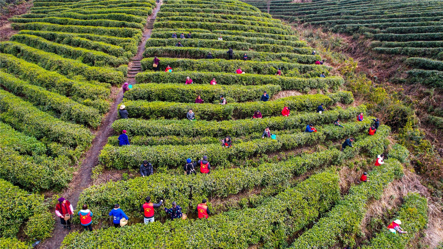 從空中俯瞰,綠油油的茶園錯落有致,猶如一道道綠色的梯田從山底綿延到山頂,青年志愿者和茶農們在線條交錯的茶園里忙碌,他們的身影宛如躍動的音符,譜寫春天里的美好樂章。