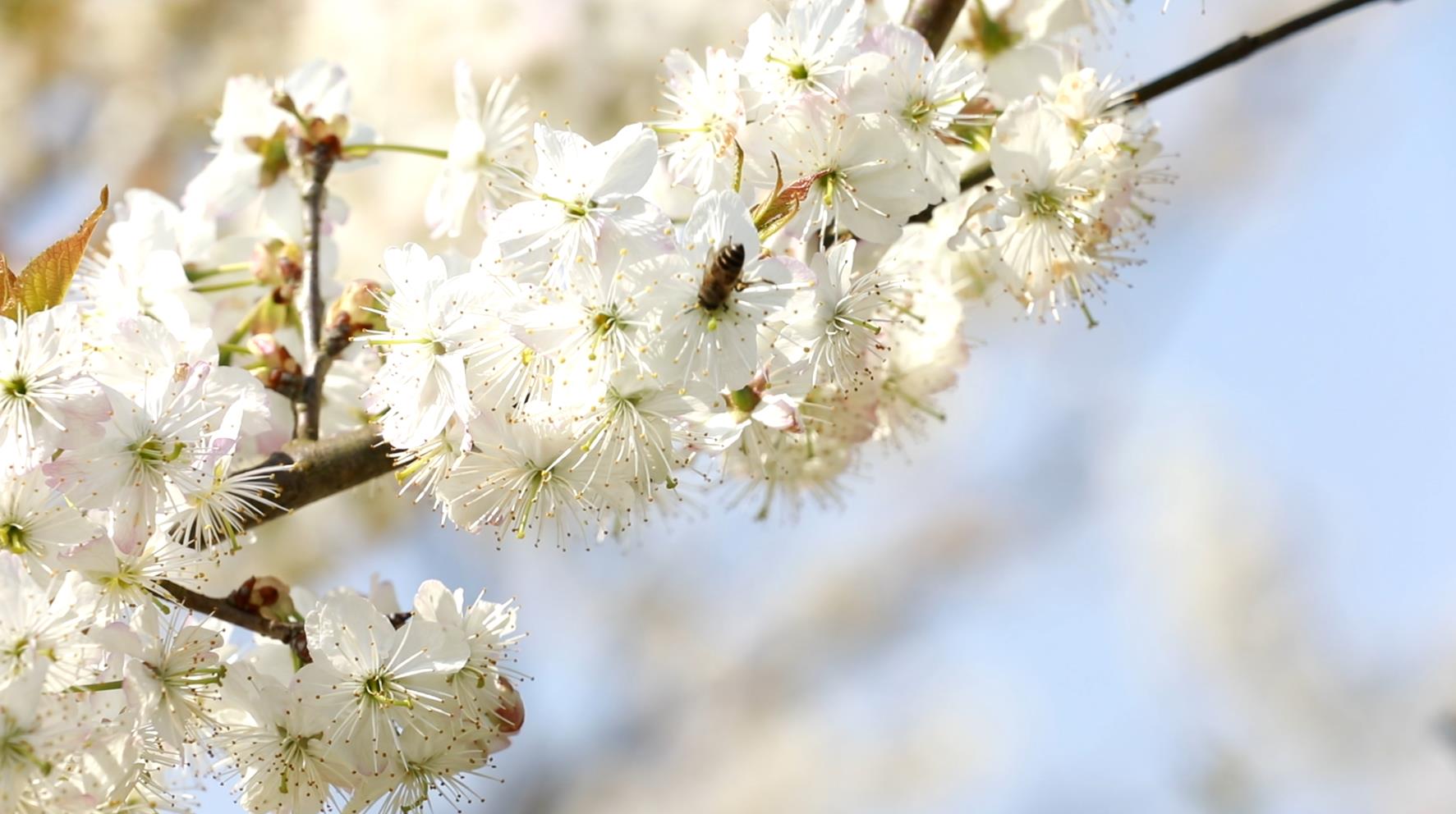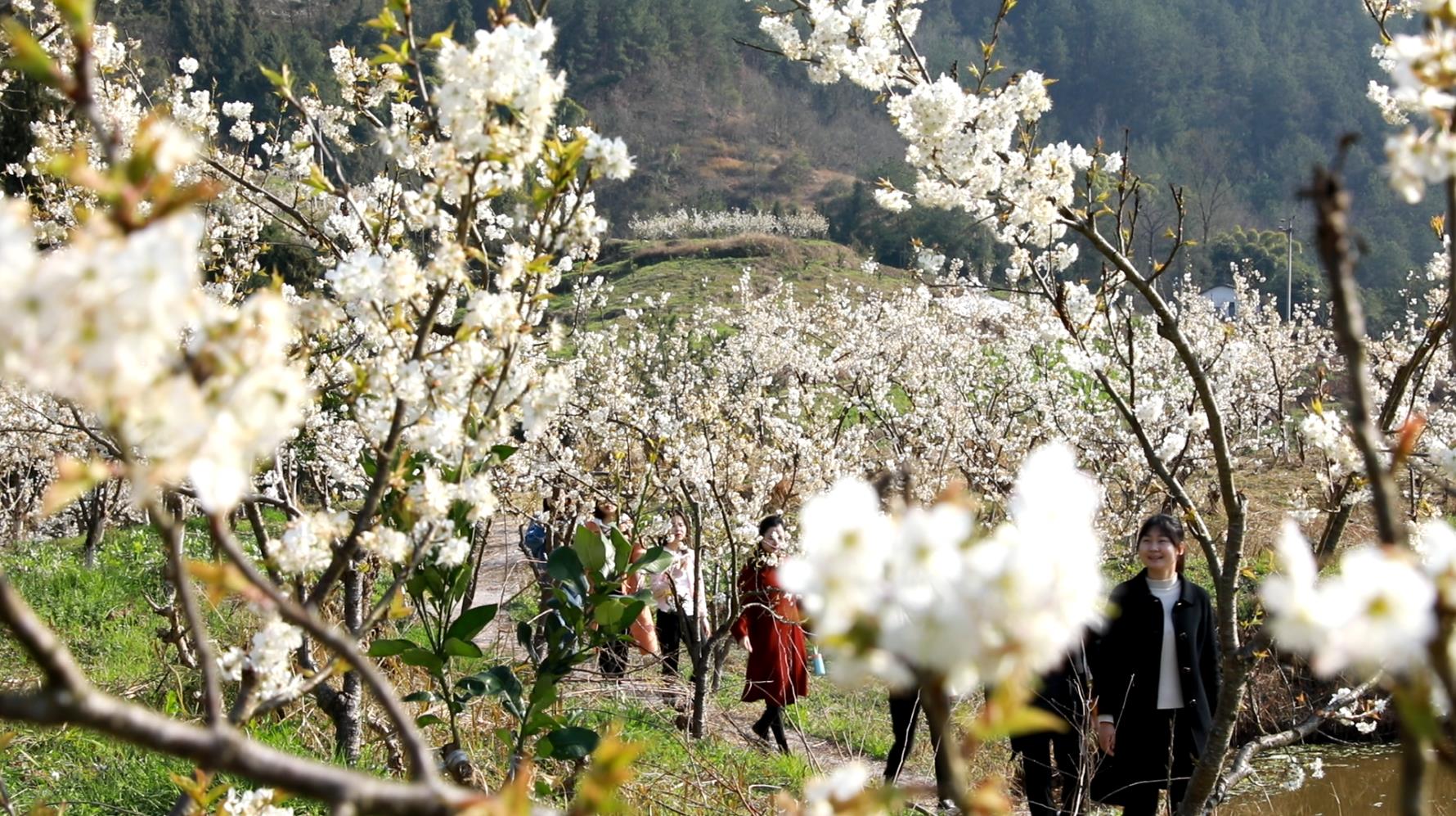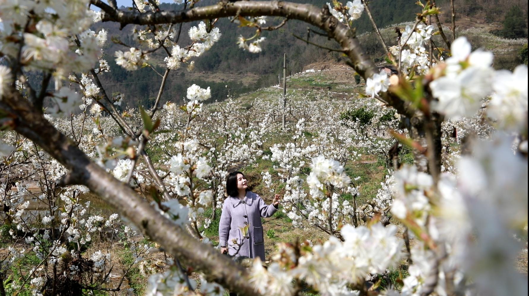 櫻桃千萬枝,照耀如雪天。沿著蜿蜒的山路行至櫻桃園,一片片雪白映入眼簾,花林深處,民房錯落有致,恍入世外桃源。一樹一樹的晶瑩,一枝一枝的花團,擠擠挨挨,密密匝匝,在藍天下盡情盛開。花束間,蜜蜂飛舞,蝴蝶翩躚。春日盛景也吸引了不少慕名而來的游人,大家徜徉在花海間,拍照留影,擁抱春光。