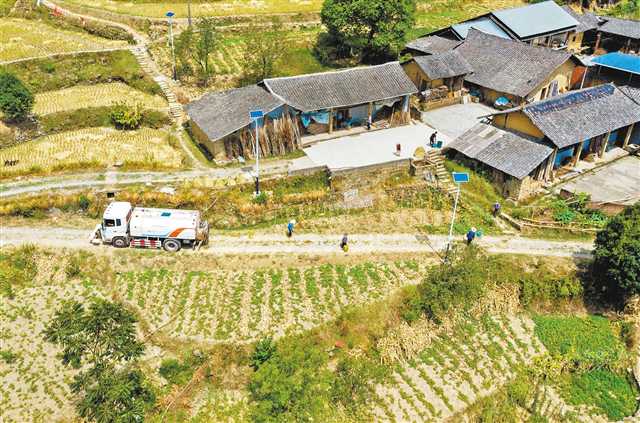 “扛吧!我們一人扛一些,慢慢把水送過去。”在朱萬美的提議下,三人將水從車上抬下,每人扛上一桶,一步一步往黃國慶家走去。