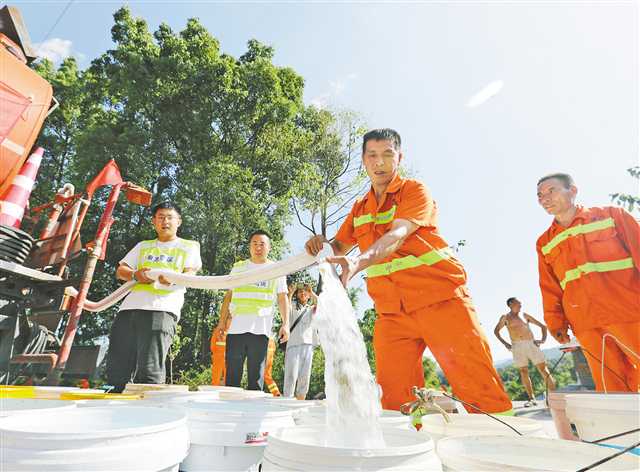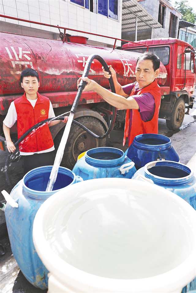 艾家村地勢偏高,受連晴高溫影響,村民用水量陡增,以致供水不足,難以正常供應村民用水。從8月5日開始,永興鎮應急供水小分隊送水車開進艾家村,把水送到村民家門口,對于村里的五保戶,志愿者還幫忙把水送到水缸里。
