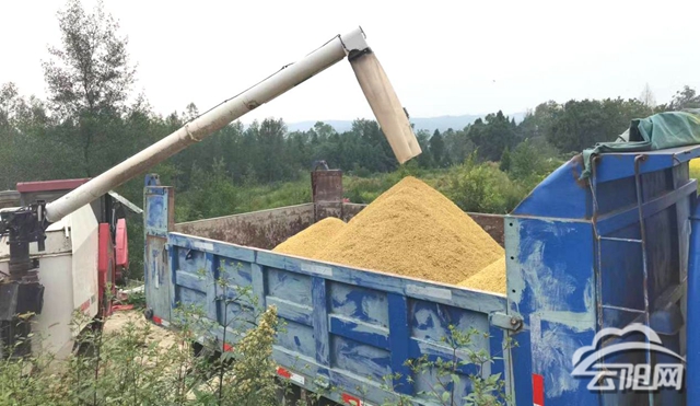收割機忙碌地穿梭著,隨著轟隆隆的機械聲響起,飽滿的、沉甸甸的稻穗被卷進機械中,干凈的谷粒通過收割機的出糧口自動裝入轉運車。