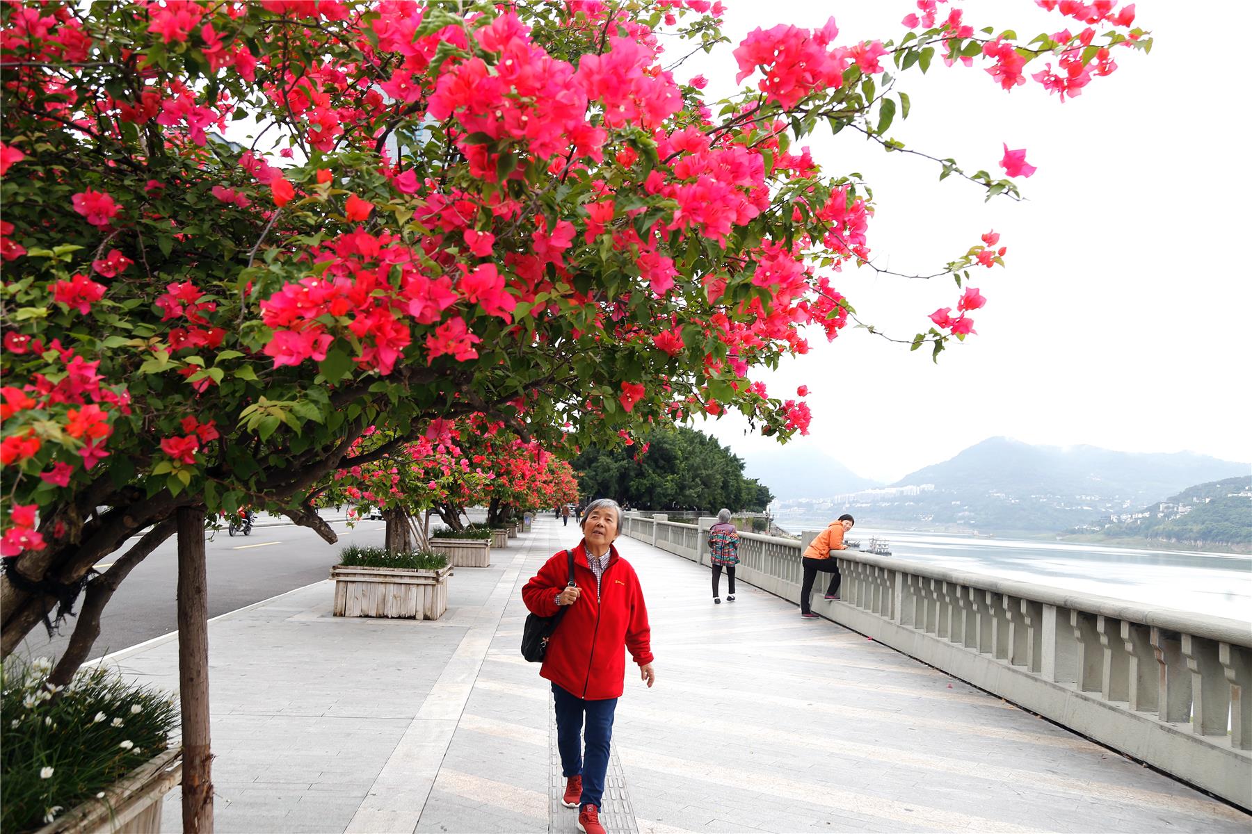 在兩江廣場,秋陽之下,一樹樹紅艷艷的三角梅開得熱烈奔放,如火似焰,一簇簇、一朵朵,燃燒在枝頭,苞片相擁,在綠葉的陪襯之下顯得格外艷麗,仿佛給道路披上了一條彩色圍巾,吸引不少市民駐足打卡。
