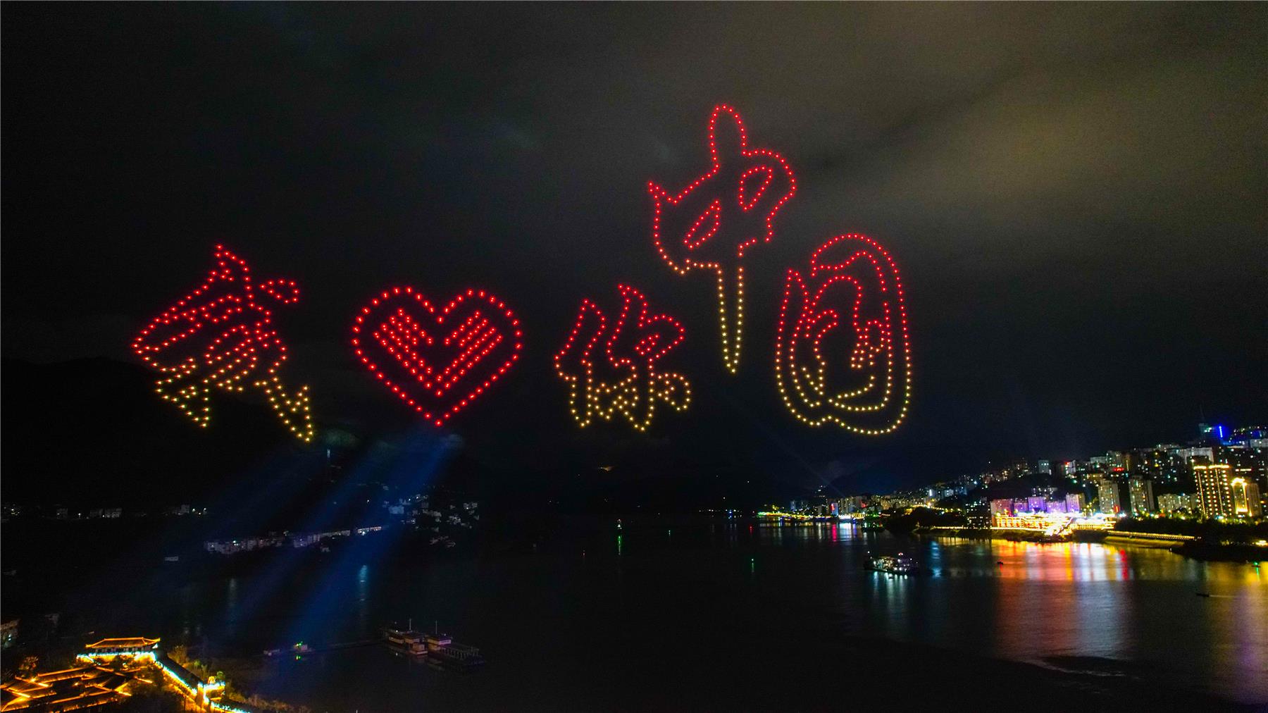 月滿人間,燈火盈天。9月28日晚,在重慶市云陽縣第三屆“天生云陽”金秋節——首屆長江國際華服藝術展上,800架閃爍著五彩燈光的無人機飛上夜空,變幻出絢爛的造型和標語,向人們傳遞著中秋、國慶的祝福。