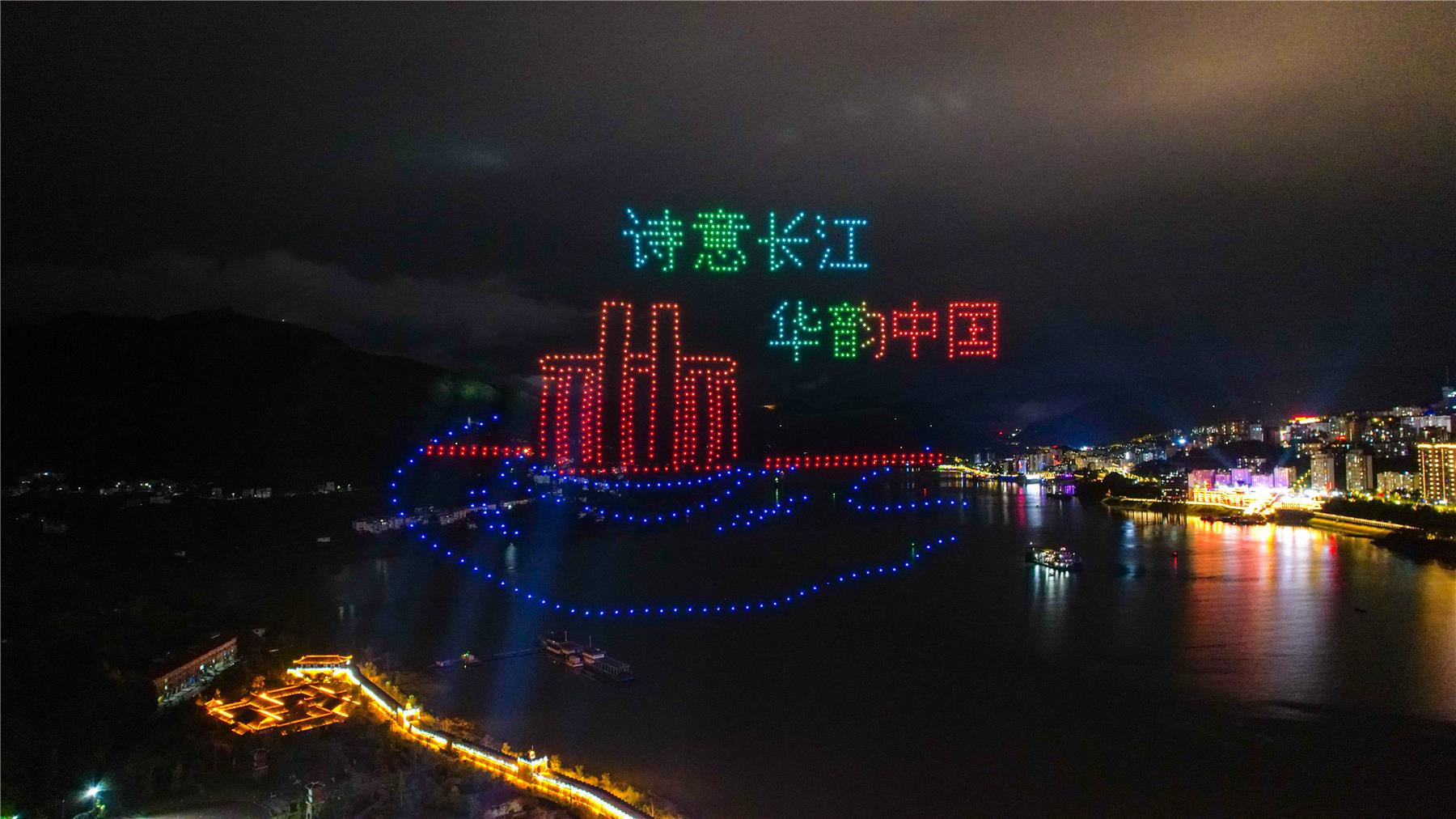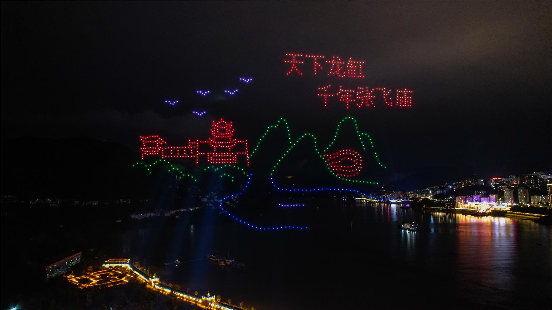 天空為幕,燈光為筆。晚上9點鐘,在長江之畔的張飛廟景區,無人機編隊表演在細雨蒙蒙中正式開場,800架無人機如夜空中的螢火蟲,匯聚成多彩的造型,點亮長江兩岸。在統一的指揮下,無人機編隊隨著燈光布陣交錯起落,在夜空中不停變換隊形,組成“嫦娥奔月”、“詩意長江 華韻中國”、“我愛你 中國”等圖案,慶祝國慶和中秋佳節的到來。
