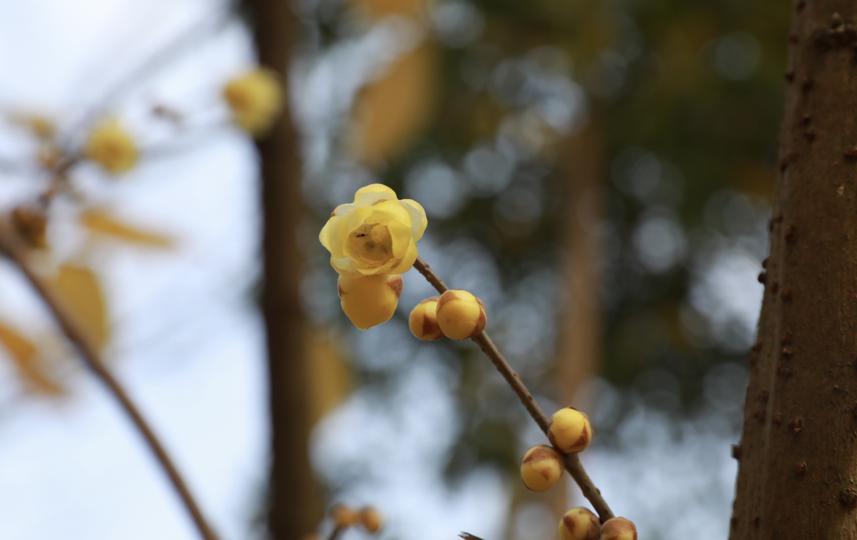 走進云頂公園,未見其花,先聞其香。遠遠望去,枝條交錯,顆粒似的點綴其上。循著花香慢慢走近,才看清這臘梅花的“真面目”,嫩黃色花瓣緊密層疊,潤澤透明,圍繞著花蕊呈壇狀開放,花形精致小巧,立于枝條上,緊挨著的還有尚待開放的花苞,豆粒般大小,底端呈褐色,頂端則呈淺黃色,似是要在這寒冷冬日,沖破束縛,傲然盛放。