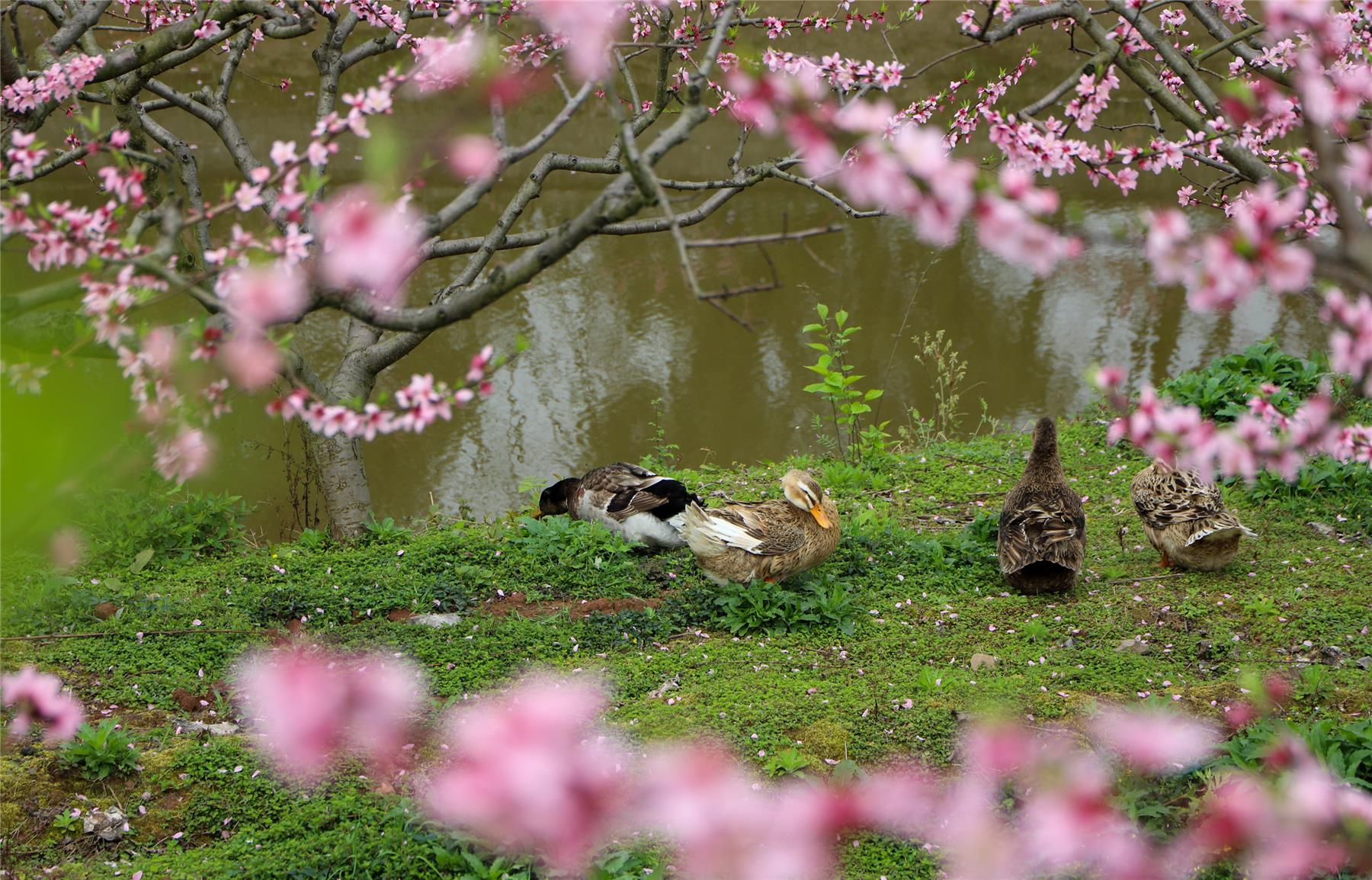 “這一片桃花開得特別好,就像粉色的云朵。旁邊又有池塘,又有鴨子嬉戲,頗有‘竹外桃花三兩枝,春江水暖鴨先知’的意境。”游客陳怡欣說。
