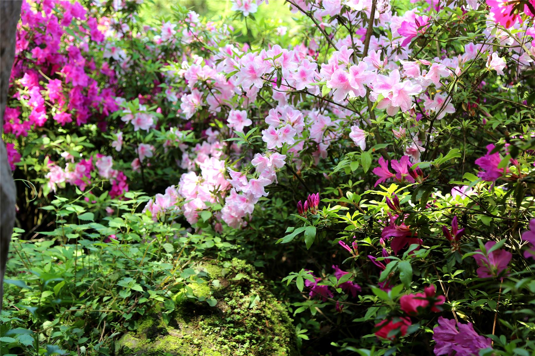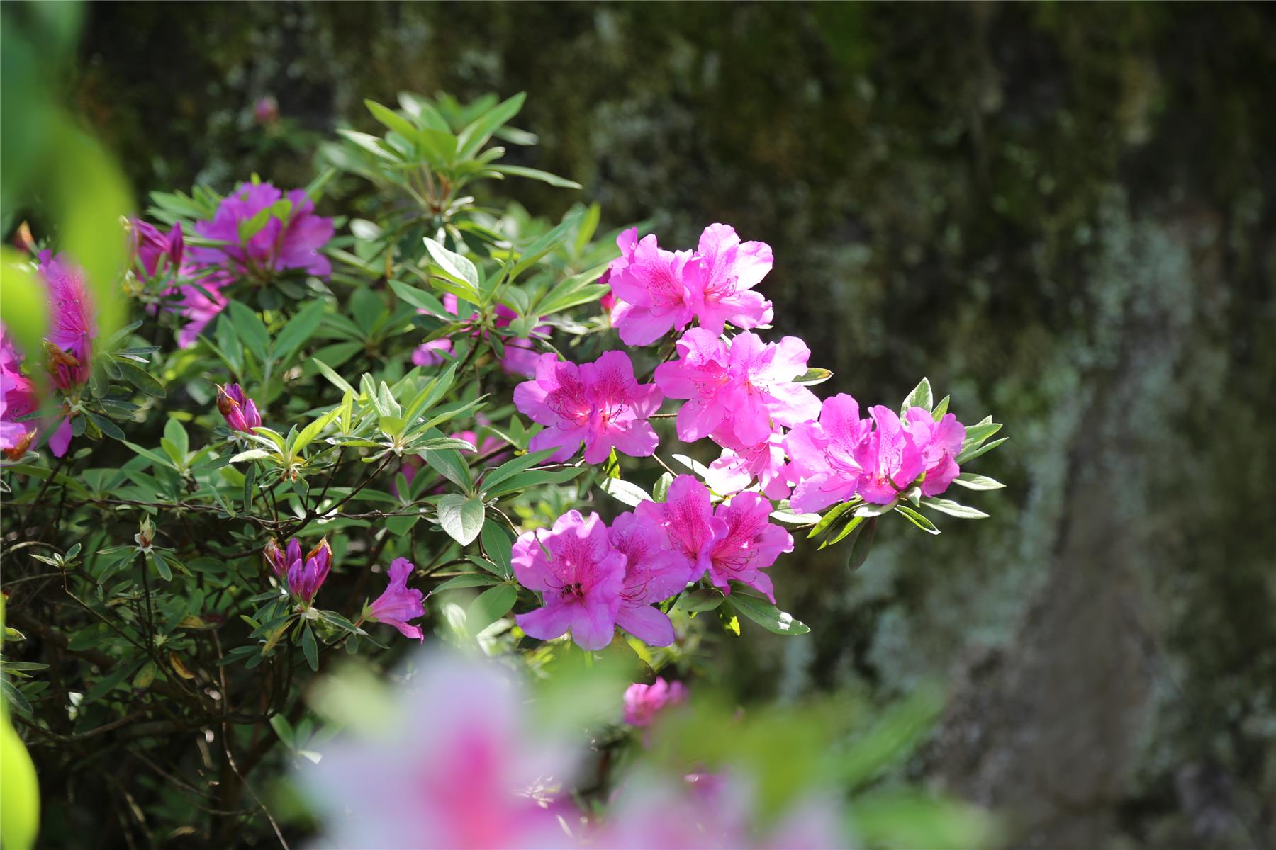 梨園內,蒼石橫臥,青苔斑駁,一株株杜鵑點綴其間,在光影的襯托下,尤有一種靜謐之美。登高遠眺,天藍云白,山青江綠,怡人的杜鵑與遠處的景色相映成趣,構成一幅賞心悅目的春日城景畫卷。