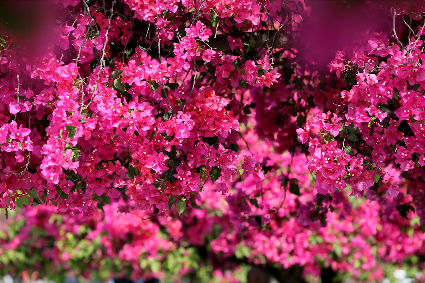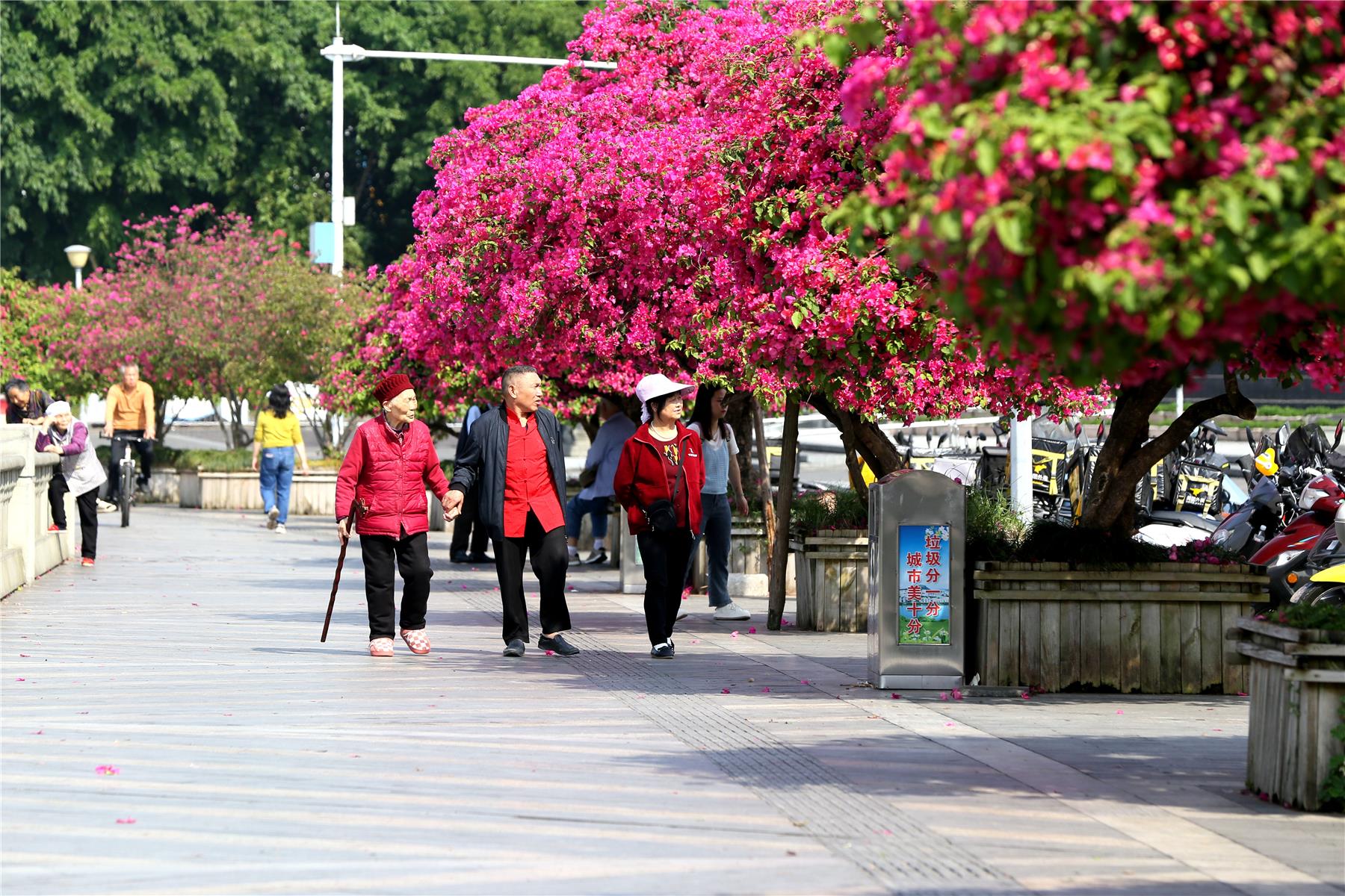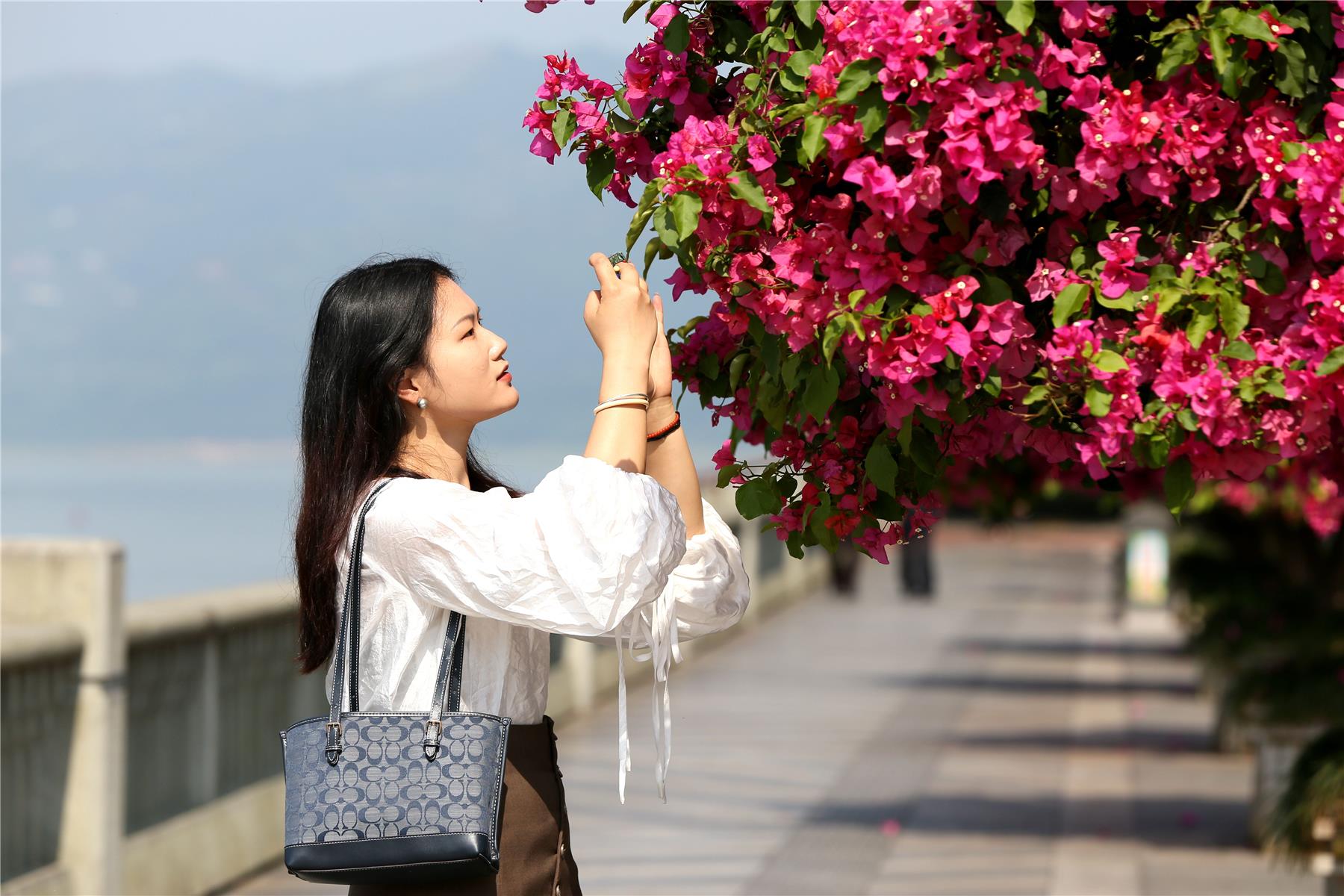 在兩江廣場,放眼望去,成排的三角梅熱情綻放,開得花團錦簇。走近細細觀賞,有的恣意怒放,隨風輕輕搖曳,燦若云霞;有的含苞待放,簇擁在一起,層層疊疊。從空中俯瞰,沿路盛開的三角梅宛如披在江邊的一條彩帶,與青山綠水相映成趣,成群的游人穿行其間,令人流連忘返。