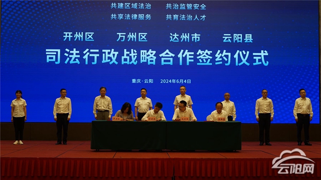云陽網(wǎng)訊(記者 李妍)6月4日,“萬達(dá)開云”司法行政戰(zhàn)略合作協(xié)議簽約儀式在我縣舉行,進(jìn)一步統(tǒng)籌四地法治資源、凝聚四地法治力量,一體推進(jìn)“萬達(dá)開云”區(qū)域法治建設(shè)。縣委常委、政法委書記劉桂虎,副縣長薛翀出席簽約儀式。