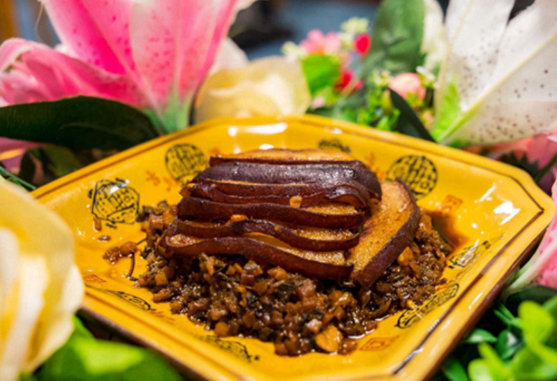 一種在當(dāng)?shù)鼗榧迺r(shí)才會(huì)制作的特色菜,有粉蒸羊肉、粉蒸排骨、鹽菜蒸扣、粉蒸南瓜等,菜品工序復(fù)雜,需要高山上特制的鲊?yán)苯泛屠消}菜才能制成。將新鮮豬肉用特制香料腌制半小時(shí),再裹上米粉放入蒸籠。經(jīng)過(guò)兩個(gè)小時(shí)噴蒸后,香氣撲鼻。