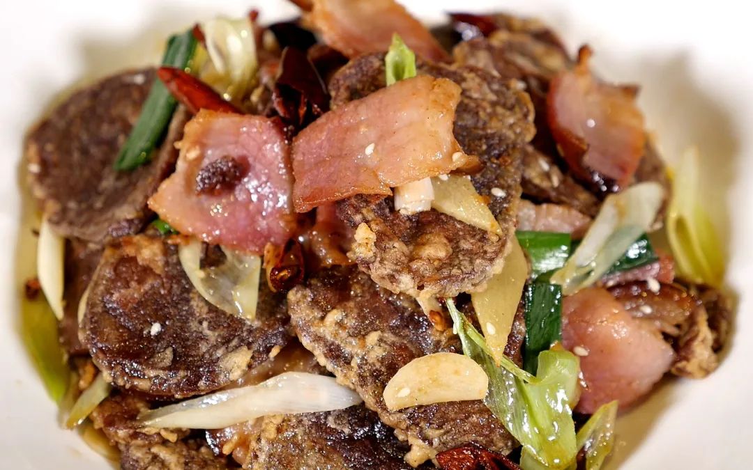 高粱粑由高粱米制成,將高粱米打碎加水攪拌后蒸制形成高粱粑,將制作好的高粱粑與臘肉一起翻炒,臘肉的香味和高粱粑粑的香味融合在一起,香味綿長。