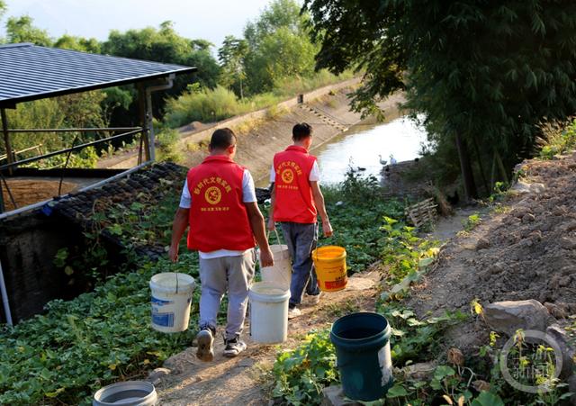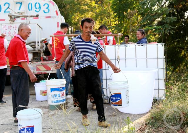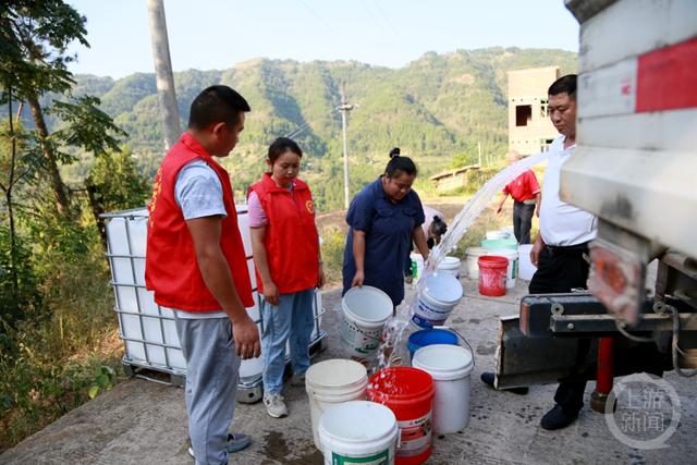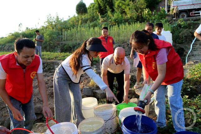 在云陽(yáng)縣云安鎮(zhèn)三灣村,村民們紛紛拿著水桶、水盆等工具,在志愿者的幫助下有序地接水、提水。