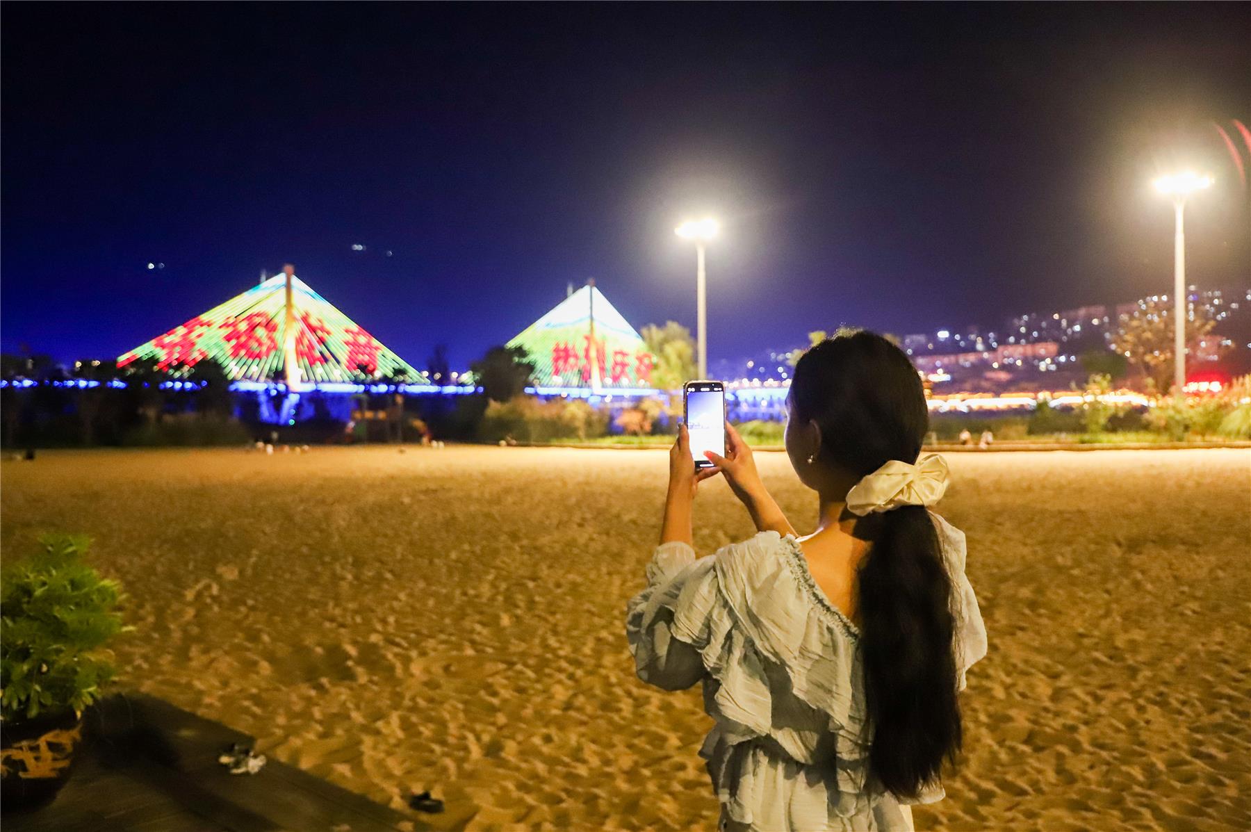9月28日晚8點,在云陽長江大橋,大橋懸索漸變出“慶祝中華人民共和國成立75周年”“不墨長江畫 無弦恐龍音”等字樣,大橋的光影倒映在波光粼粼的江面上,呈現出五彩斑斕的效果,吸引不少市民駐足停留,拍照賞景。