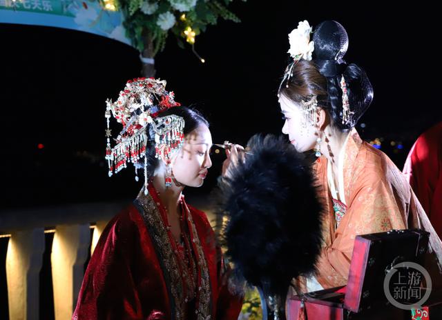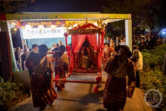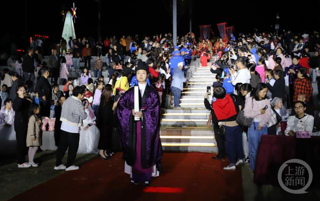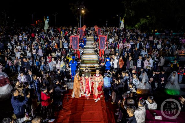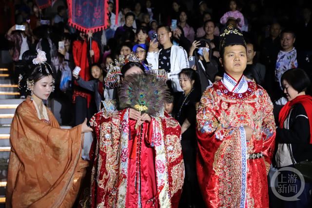 10月5日晚,在云陽縣月光草坪一生一世長廊,行加冠之禮后的“新婿”整裝待發,用八抬大轎的方式迎娶“新婦”。
