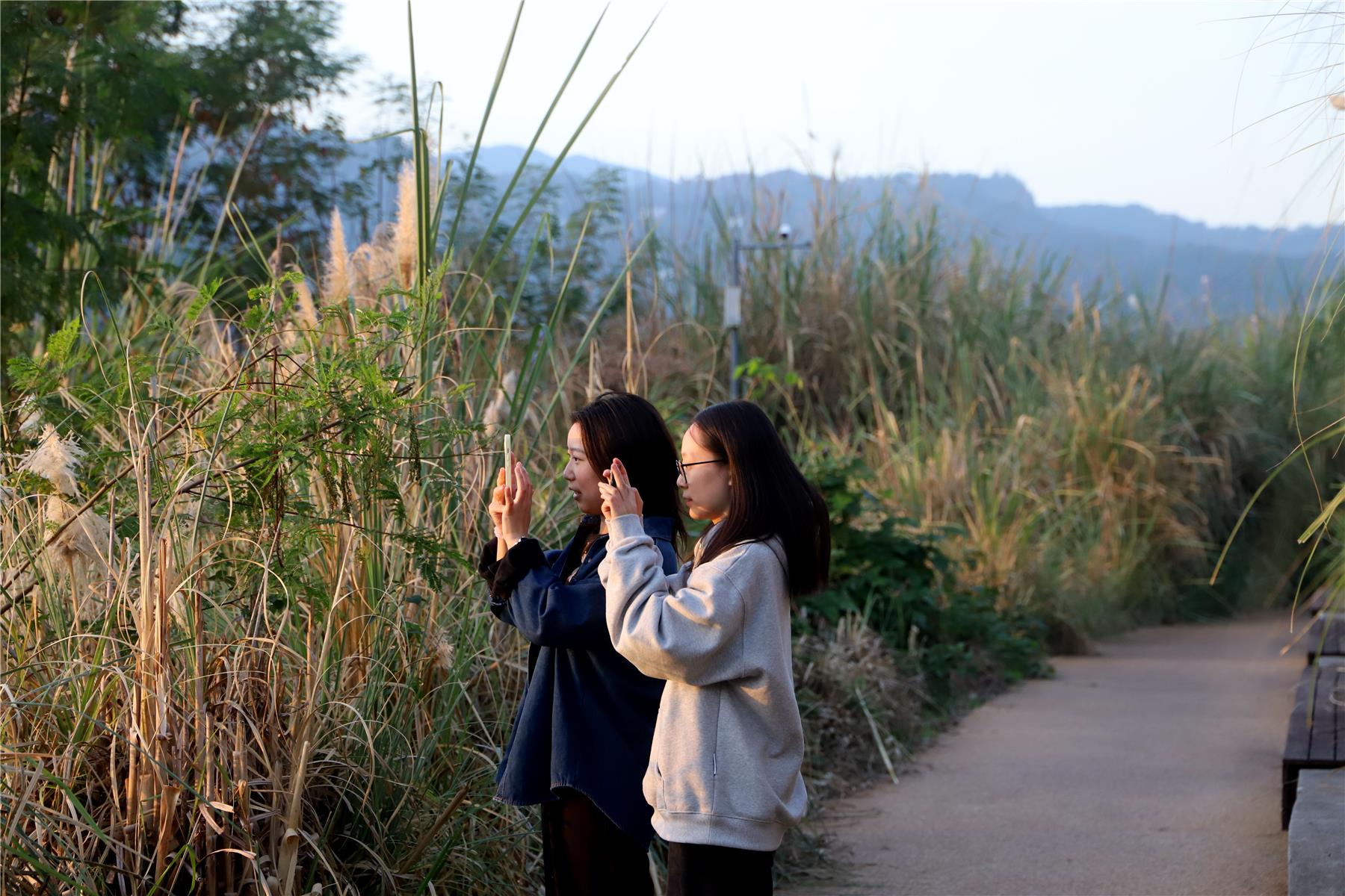 在環(huán)湖綠道白鷺公園,一株株如雪花般的蘆葦花紛紛揚(yáng)揚(yáng),盛開成一片夢幻海洋,微風(fēng)輕拂,潔白的蘆葦花搖曳生姿。每當(dāng)夕陽西下,江面上波光粼粼,點(diǎn)點(diǎn)碎金。晚霞映照在蘆葦叢中,金色的光輝與蘆葦?shù)慕瘘S相互映襯,構(gòu)成了一幅動(dòng)人的畫面,不少市民來此打卡,記錄下這動(dòng)人的時(shí)刻。