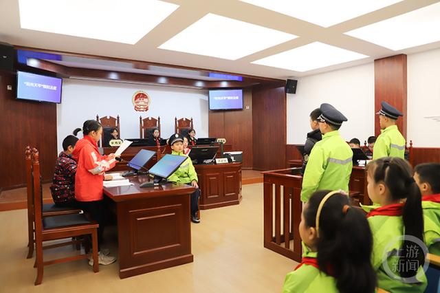 學生們在“陽光天平”模擬法庭模擬案件審判。