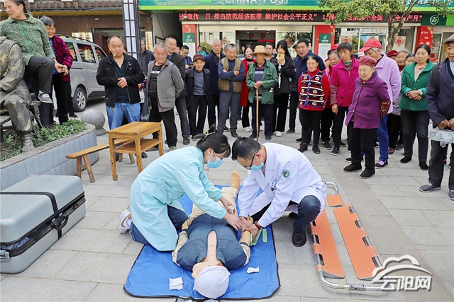 演練以連續暴雨誘發滑坡為背景,監測員巡查發現滑坡體裂縫增寬、民居出現新裂痕,立即通過銅鑼與高音喇叭發布撤離預警。經現場測試,社區3分鐘內核實險情,鎮政府2分鐘內完成上報,10分鐘內啟動應急預案,明確撤離范圍覆蓋16戶78人,一場速度與險情的“競速賽”迅速展開。鎮衛生院在長嶺社區廣場對群眾進行了危急病人的心肺復蘇培訓,指導群眾在危急病人面前如何有效處理,做到臨危不亂。