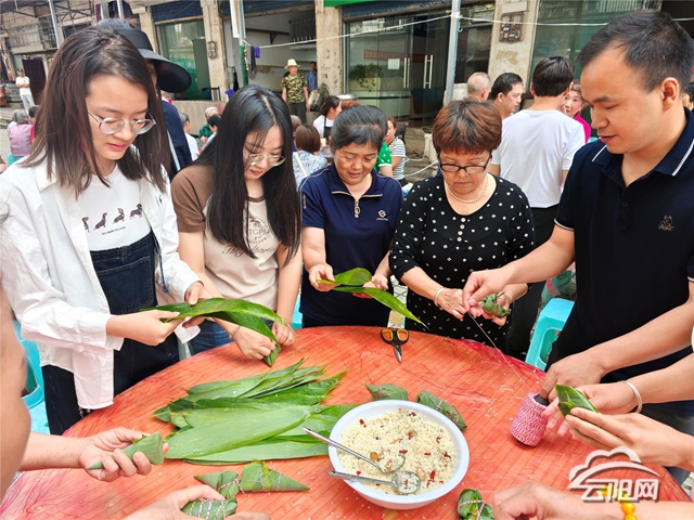 活動現場還設置了包粽子體驗區,居民們圍坐在一起,巧手翻飛間,翠綠的粽葉裹著雪白的糯米,轉眼就變成了一個個飽滿的粽子。大家一邊切磋包粽技巧,一邊嘮家常話里短,現場粽葉飄香,笑語不斷。來參加活動的許阿姨高興地說:“今天不僅有好看的文藝表演,還能和大家一起包粽子、吃餃子,感覺這個節日過得特別有儀式感,也很有氛圍感!”