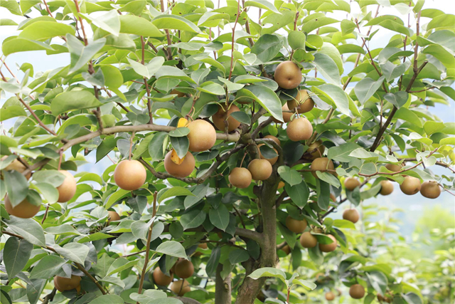 走進梨園,綠意盎然的景象撲面而來。一株株梨樹枝繁葉茂,層層疊疊的綠葉間,飽滿碩大的梨子或青或黃,沉甸甸地壓彎了枝頭,空氣中彌漫著清甜的果香。三五成群的游客穿梭在林間,有的踮腳挑選,有的伸手采摘,有的捧著剛摘下的梨子品嘗,歡聲笑語在梨園中回蕩,盡情享受著采摘的樂趣。