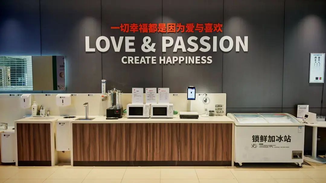 身高體重秤、血壓儀、直飲水機、微波爐一字排開