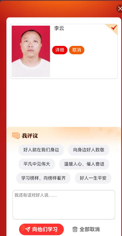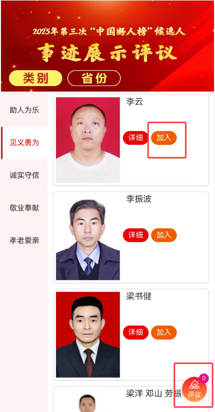 進入“事跡展示評議”頁面參與活動