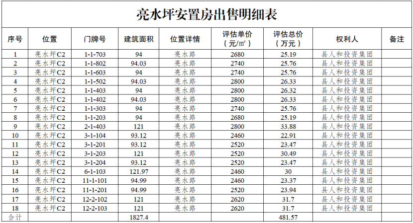 第一批標的轉讓方為云陽縣人和投資開發(集團)有限公司,標的系重慶市云陽縣青龍街道亮水坪社區C區安置房(共18套),總建筑面積1827.4平方米。