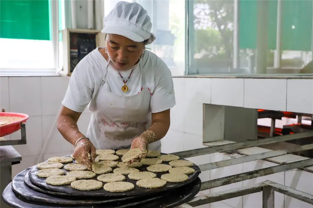 手腕輕轉,裹著芝麻的餅坯在他掌心快速旋轉,捶打三下后竟自然綻成完美的滿月狀。這道傳承百年的上麻工序,李明已經練了整整三十年。