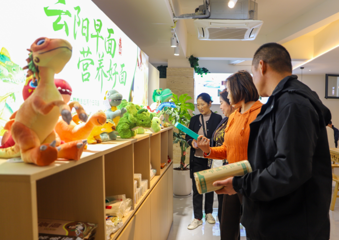 云陽早面此番進軍重慶中心城區,顯然做足了準備。280平方米的店面,不僅有統一的云陽早面門頭裝潢和Logo標識,還專門設置了產品展示區。來自云陽當地的面食、調料、農特產品琳瑯滿目,更有恐龍“龍寶”和“乖妹”等云陽特色文創產品點綴其間,講述著云陽作為“中國面食美食地標城市”的故事。