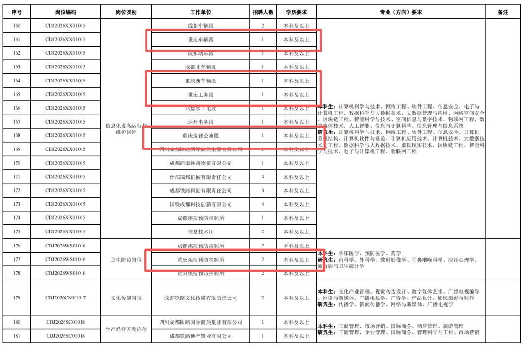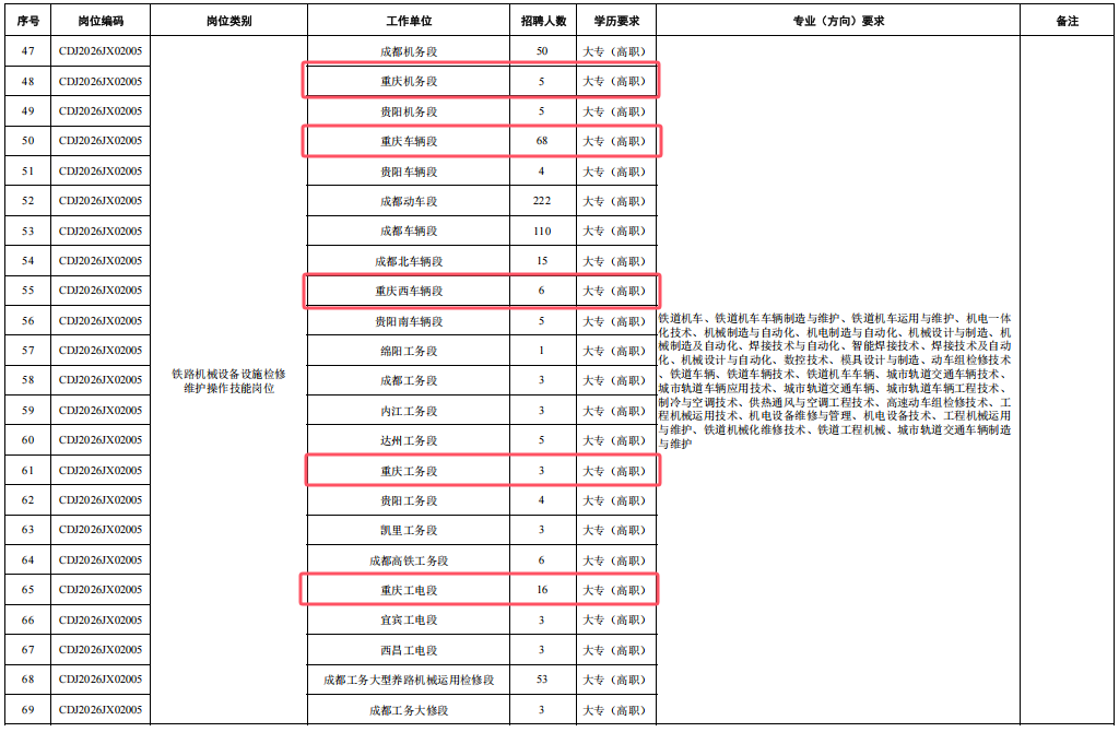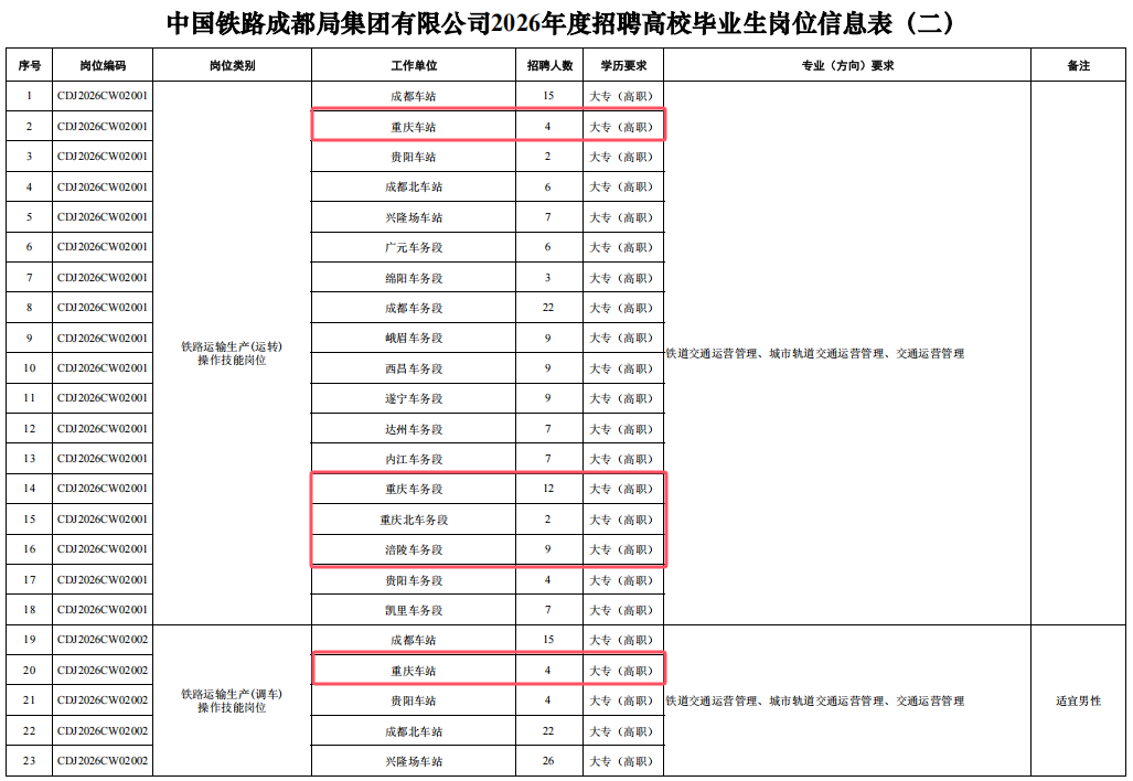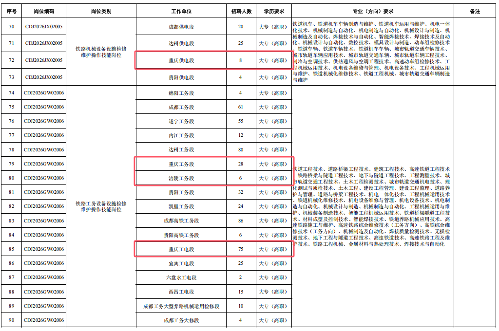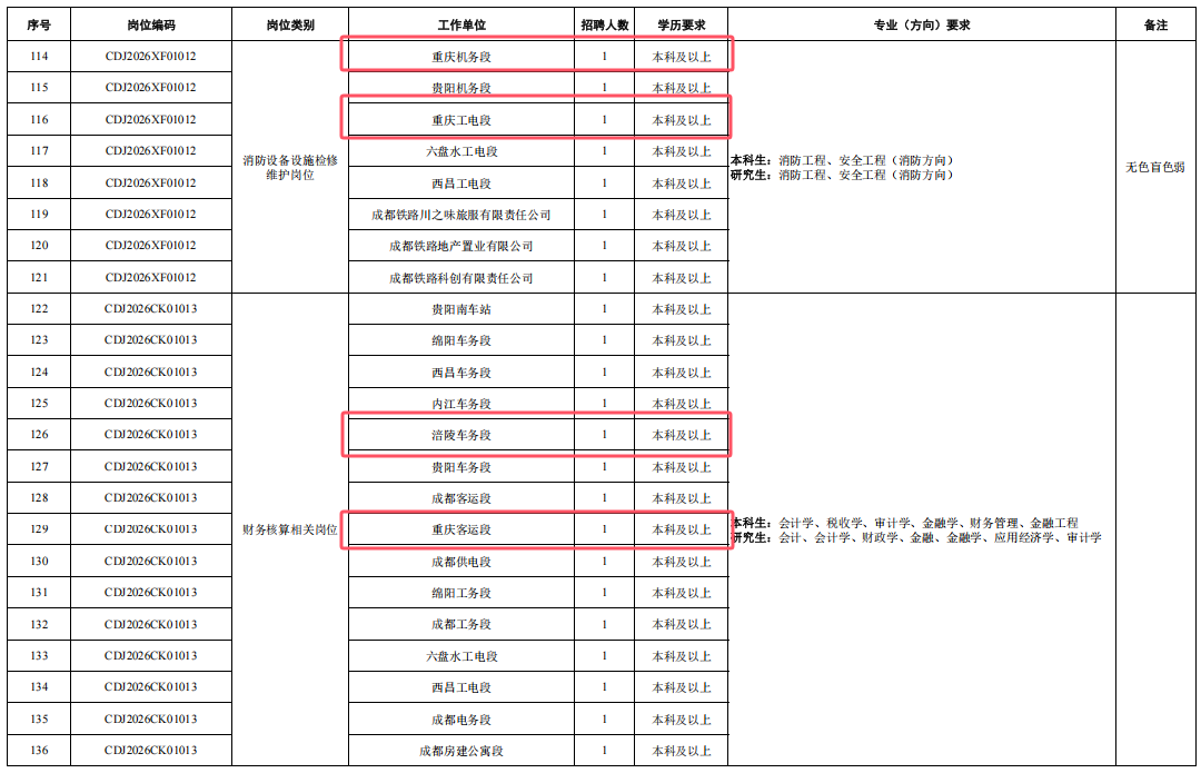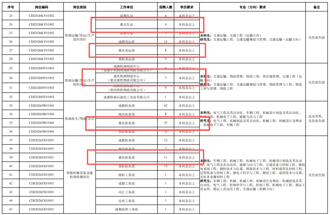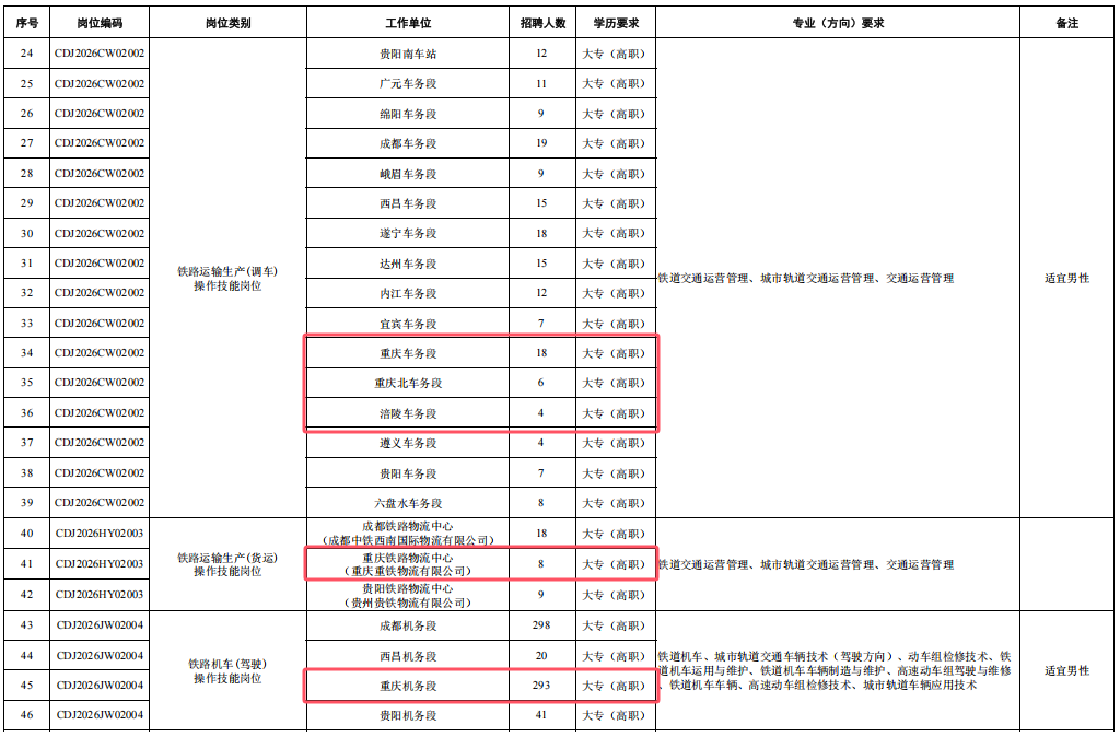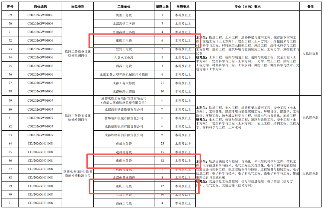 4.身心健康,具有良好的心理素質(zhì),聽力、視力良好,部分崗位要求無色盲色弱,具備正常履行崗位職責(zé)的身體條件,符合招聘崗位職業(yè)健康規(guī)范標(biāo)準(zhǔn)。其中崗位編碼為CDJ2026JW01004崗位,要求身體條件符合《鐵路機(jī)車車輛駕駛?cè)藛T健康檢查規(guī)范》(TB/T3091-2019)規(guī)定標(biāo)準(zhǔn)。