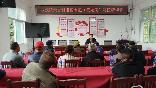 11月3日,雙龍鎮六合村組織開展柑橘木虱(黃龍?。┓揽嘏嘤枙?,邀請農技專家現場授課,50余名果農參加培訓。
