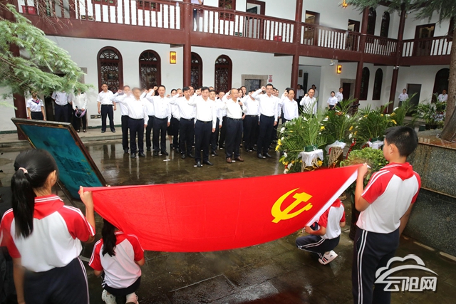 在彭詠梧革命烈士塑像前,張學鋒一行向革命先烈敬獻花籃。三鞠躬后,張學鋒帶領大家舉起右手,面對鮮艷的黨旗,重溫入黨誓詞,表達了對中國共產黨、對革命烈士的敬仰之情。
