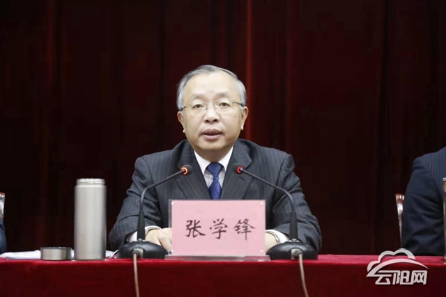 縣委書記張學(xué)鋒講話。縣委副書記、縣長覃昌德主持會議。